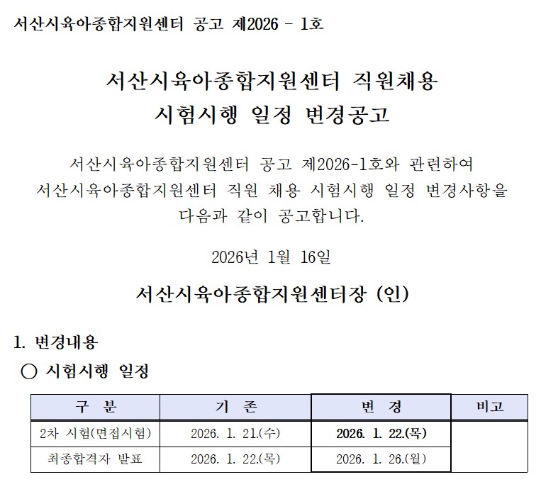 [서산시육아종합지원센터] 직원 채용 일정 변경 안내