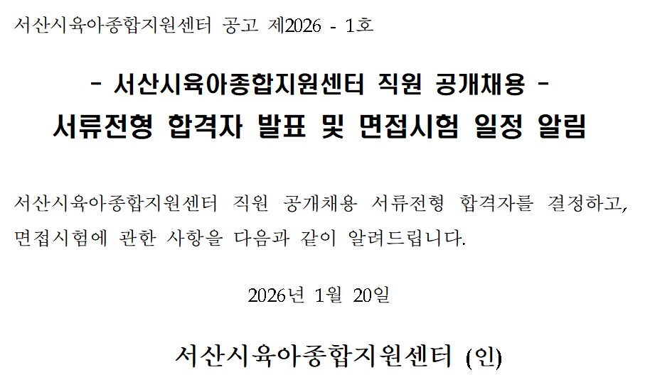 [서산시육아종합지원센터] 대체교사 직원채용 서류전형 합격자 발표