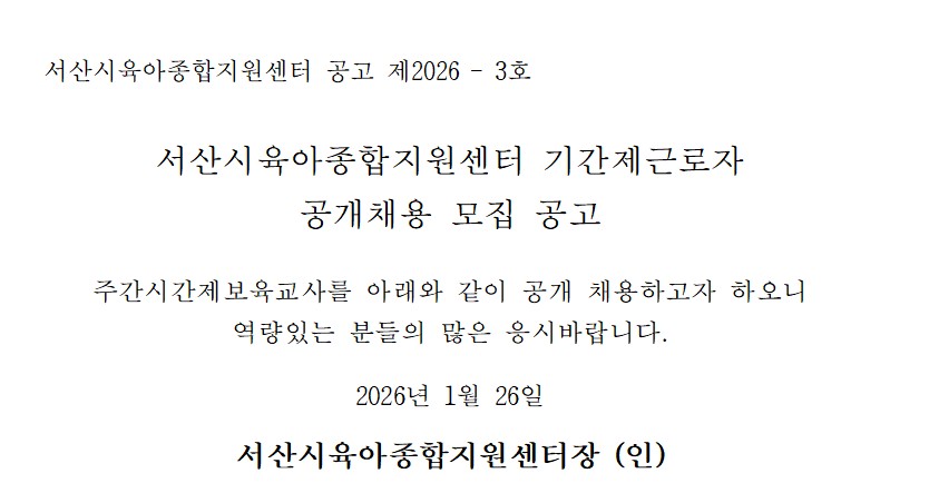 서산시육아종합지원센터 기간제근로자 직원 공개 채용 공고(주간시간제보육교사)