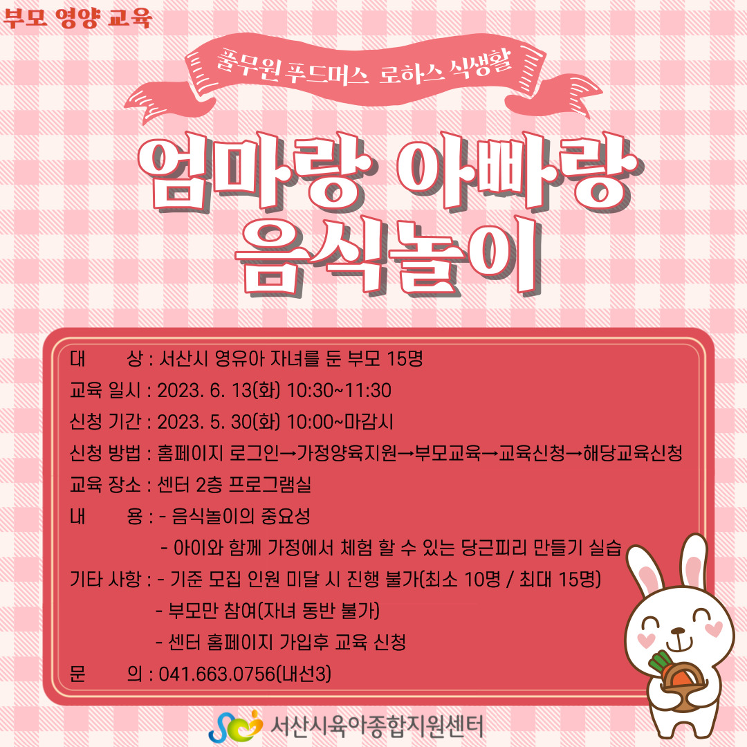 | 기타사항 | -기준 모집 인원 미달 시 진행 불가합니다.(최소 10명/최대 15명) -자녀 동반 불가 *변 경 사 항* -부모영양교육 실습 내용이 당근 라페에서 당근 피리로 변경되었습니다. 참고 부탁드립니다. |