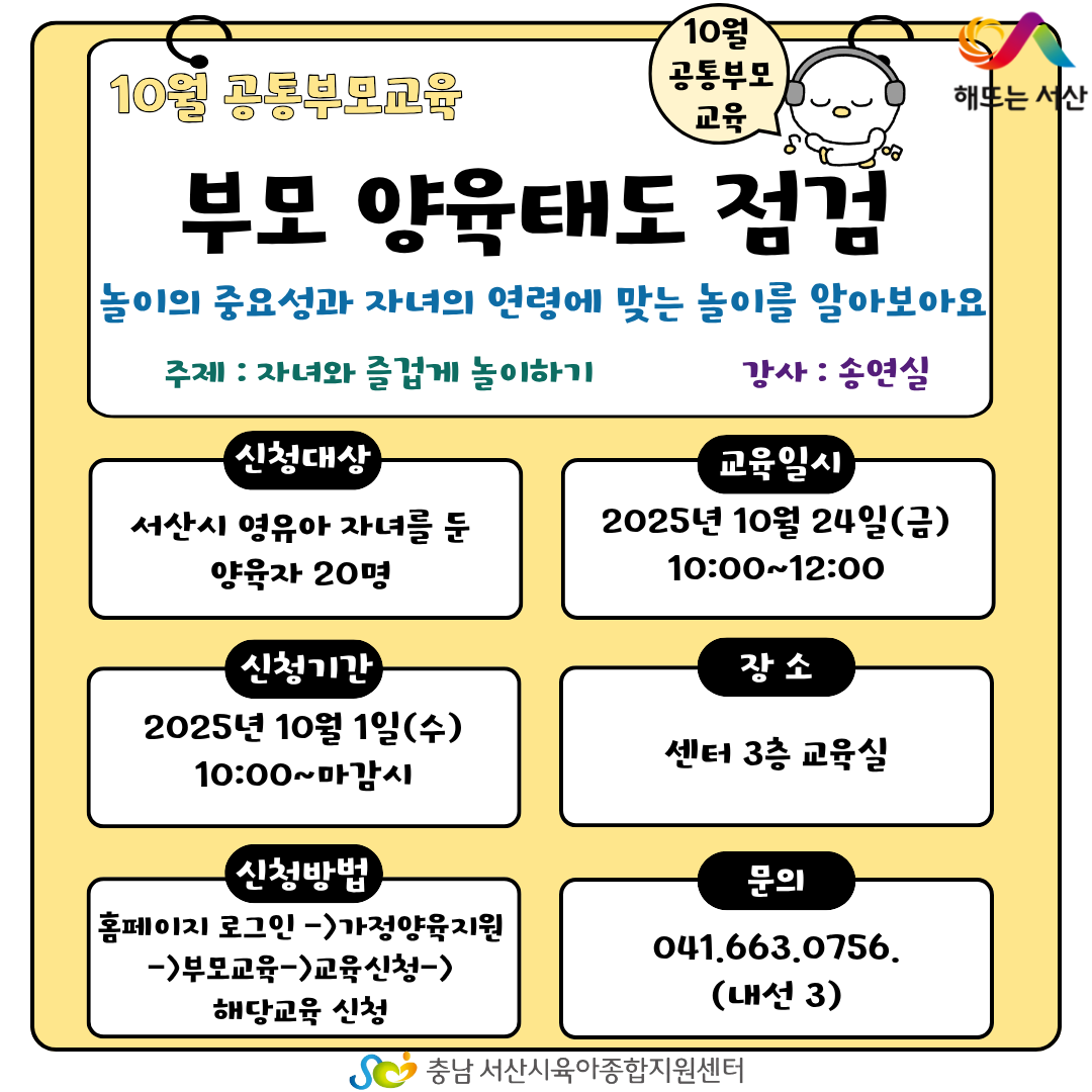 | 기타사항 | ■ 원활한 교육 진행을 위해 시간을 지켜주시기 바랍니다. ■ 참석이 어려우실 경우 담당자에게 연락을 주시기 바랍니다. ■ 센터 주차장이 협소하니 인근 공영주차장을 이용해 주시기 바랍니다 ■ 자녀 동반 불가이며 양육자만 참석 가능합니다. ■ 모집 최소 인원 미충족 시, 폐강 가능 |