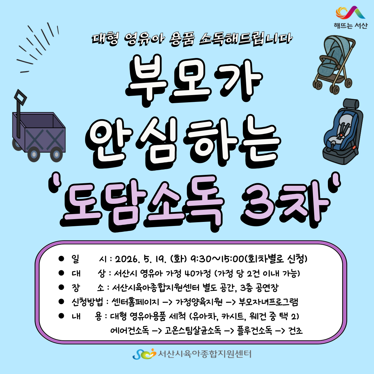 | 기타사항 | - 부모 인증 후 신청 바랍니다. - 소독 품목은 대형 영유아용품으로 (유아차, 카시트, 웨건) 1인당 최대 2건까지 가능합니다. - 카시트는 안전을 위해 반드시 보호자께서 직접 차량에서 탈거 및 장착해주셔야 합니다. - 선풍기, 모빌, 컵홀더 등 모든 부착물은 반드시 제거 후 맡겨주세요. (미제거 시 소독이 불가하거나, 분실 및 파손에 대해 책임지지 않습니다.) - 분실 방지를 위해 대여 및 반납 시 본인 확인을 진행합니다. - 소독 완료 후 30분 이내에 반드시 제품을 회수해 주시기 바랍니다. (공간 협소로 인해 장기 보관이 어려우니 협조 부탁드립니다.) - 본 서비스는 ‘살균 소독’중심이며, 곰팡이나 찌든 때를 제거하는 ‘세탁 서비스가’ 아님을 알려드립니다. - 노후화된 제품의 자연적인 변색이나 기기 결함으로 인한 파손에 대해서는 책임지지 않으니, 제품 접수 전 상태를 꼼꼼히 확인 바랍니다. |