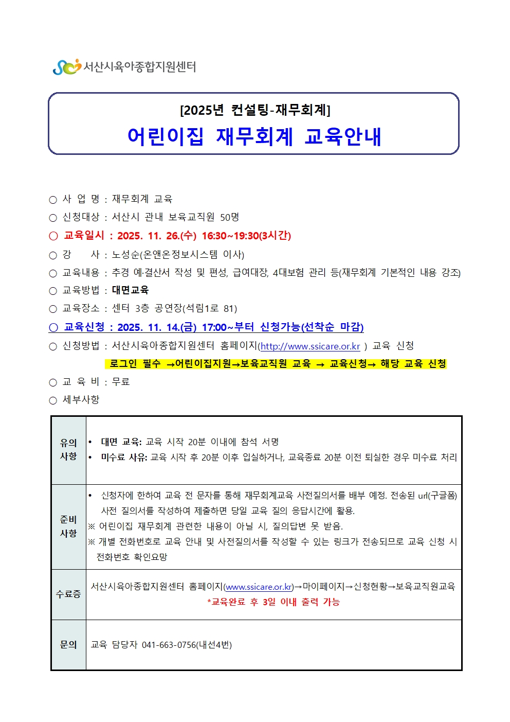 | 기타사항 | ● 대면 교육: 교육 시작 20분 이내에 참석 서명 ● 미수료 사유: 교육 시작 후 20분 이후 입실하거나, 교육종료 20분 이전 퇴실한 경우 미수료 처리 ● 신청자에 한하여 교육 전 문자를 통해 재무회계교육 사전질의서를 배부 예정. 전송된 url(구글폼)사전 질의서를 작성하여 제출하면 당일 교육 질의 응답시간에 활용. ※ 어린이집 재무회계 관련한 내용이 아닐 시, 질의답변 못 받음. ※ 개별 전화번호로 교육 안내 및 사전질의서를 작성할 수 있는 링크가 전송되므로 교육 신청 시 전화번호 확인요망 |