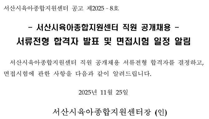 [서산시육아종합지원센터] 기간제 근로자 재공고 채용 서류전형 합격자 발표
