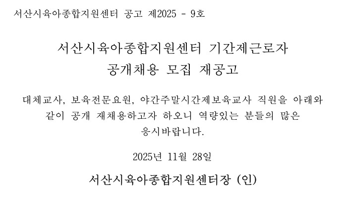 [서산시육아종합지원센터] 기간제근로자 직원 공개 재채용 모집 공고(2차)