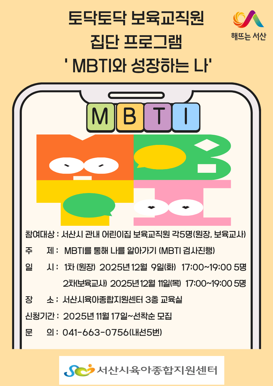 토닥토닥 보육교직원 집단프로그램 'MBTI'와 성장하는 나' 대상자 모집