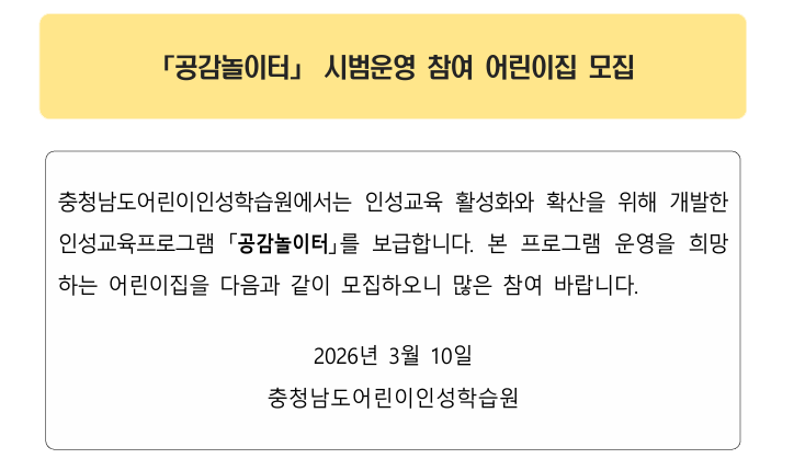 2026년도 유아인성교육프로그램 [공감놀이터] 운영 어린이집 공개 모집