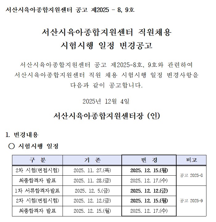 [서산시육아종합지원센터] 직원 채용 일정 변경 안내