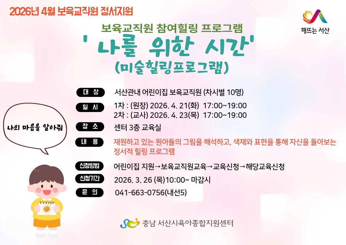 | 기타사항 | 원아들의 그림 해석방법을 알고, 색채와 표현을 통해 자신을 돌아보는 정서적 힐링 프로그램입니다. | ||